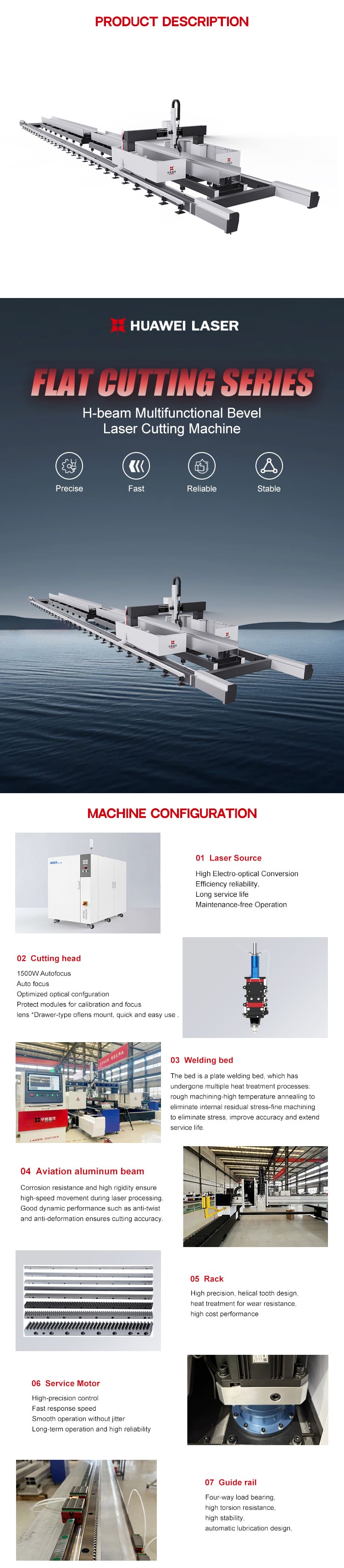 Máy cắt Laser chùm tia H 3D CNC 12000W để gia công thép kim loại là giải pháp công nghiệp có độ chính xác cao của Công ty TNHH Sản xuất Thiết bị Laser Thẩm Dương Huawei. Được thiết kế để cắt hiệu quả dầm chữ H, kết cấu thép và các thành phần kim loại nặng, nó được trang bị nguồn laser sợi quang công suất cao 12000W để đảm bảo tốc độ nhanh, độ xuyên sâu và các cạnh cắt mịn. Hệ thống điều khiển CNC 3D cho phép cắt phức tạp và chính xác, đáp ứng nhu cầu xây dựng quy mô lớn, đóng tàu, sản xuất máy móc, gia công thép. Với hiệu suất ổn định, mức bảo trì thấp và tuổi thọ dài, chiếc máy này kết hợp giá bán trực tiếp tại nhà máy với công nghệ tiên tiến, khiến nó trở thành lựa chọn đáng tin cậy của bạn để cắt kim loại công nghiệp nặng.