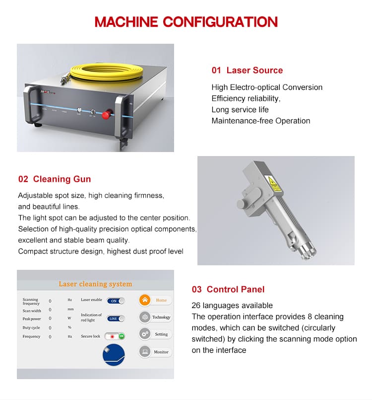 Là một máy làm sạch bằng laser không tiếp xúc, nó không làm hỏng bề mặt của các bộ phận, không tiết kiệm năng lượng và bảo vệ môi trường, đồng thời có thể loại bỏ nhựa, dầu, vết bẩn, bụi bẩn/rỉ sét, lớp phủ, lớp phủ và sơn khỏi bề mặt phôi một cách hiệu quả để đáp ứng các yêu cầu làm sạch trên mô hình phức tạp và định vị tốt trong lĩnh vực chế biến công nghiệp, đạt được hiệu quả làm sạch ở mức độ sạch cao hơn và mang lại lợi ích sản xuất với chi phí toàn diện thấp hơn.