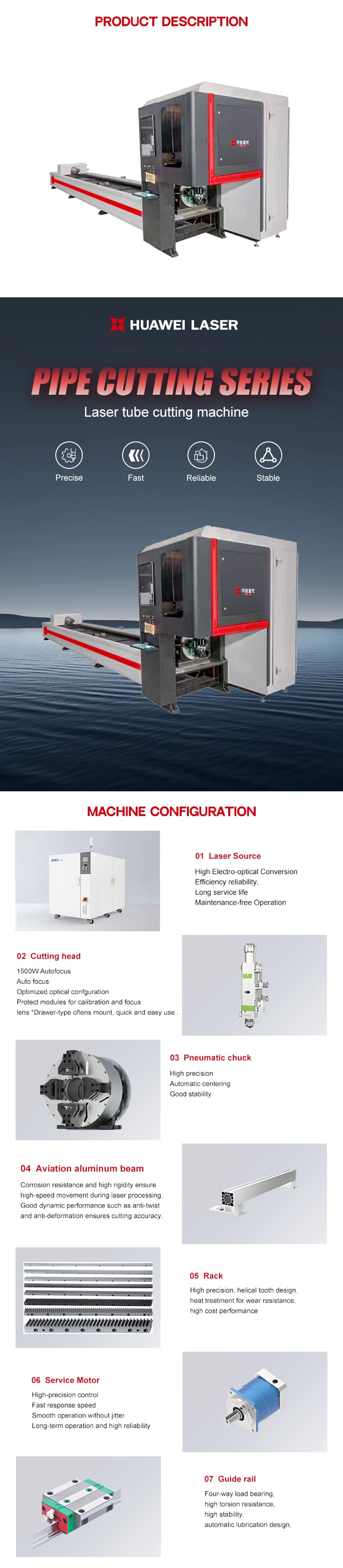 cácHUAWEI RENR Máy cắt laser sợi quang ống đôi có độ chính xác cao 6000Wlà một giải pháp thay thế Máy hàn Laser cầm tay tiên tiến được thiết kế đặc biệt để xử lý ống và ống hiệu suất cao. Được trang bị mâm cặp khí nén kép, nó đảm bảo kẹp ổn định, định tâm tự động và xoay chính xác để cắt mịn, chính xác trên các ống kim loại tròn, vuông và không đều. Nguồn laser sợi quang công suất cao mang lại tốc độ cắt nhanh, các cạnh sạch và biến dạng nhiệt tối thiểu. Được thiết kế để chế tạo kim loại, sản xuất đồ nội thất, sản xuất thiết bị thể dục và linh kiện ô tô,MÁY LASER CỦA HuaweiHệ thống cắt ống mang lại độ chính xác, độ tin cậy và năng suất vượt trội cho các ứng dụng công nghiệp hiện đại.